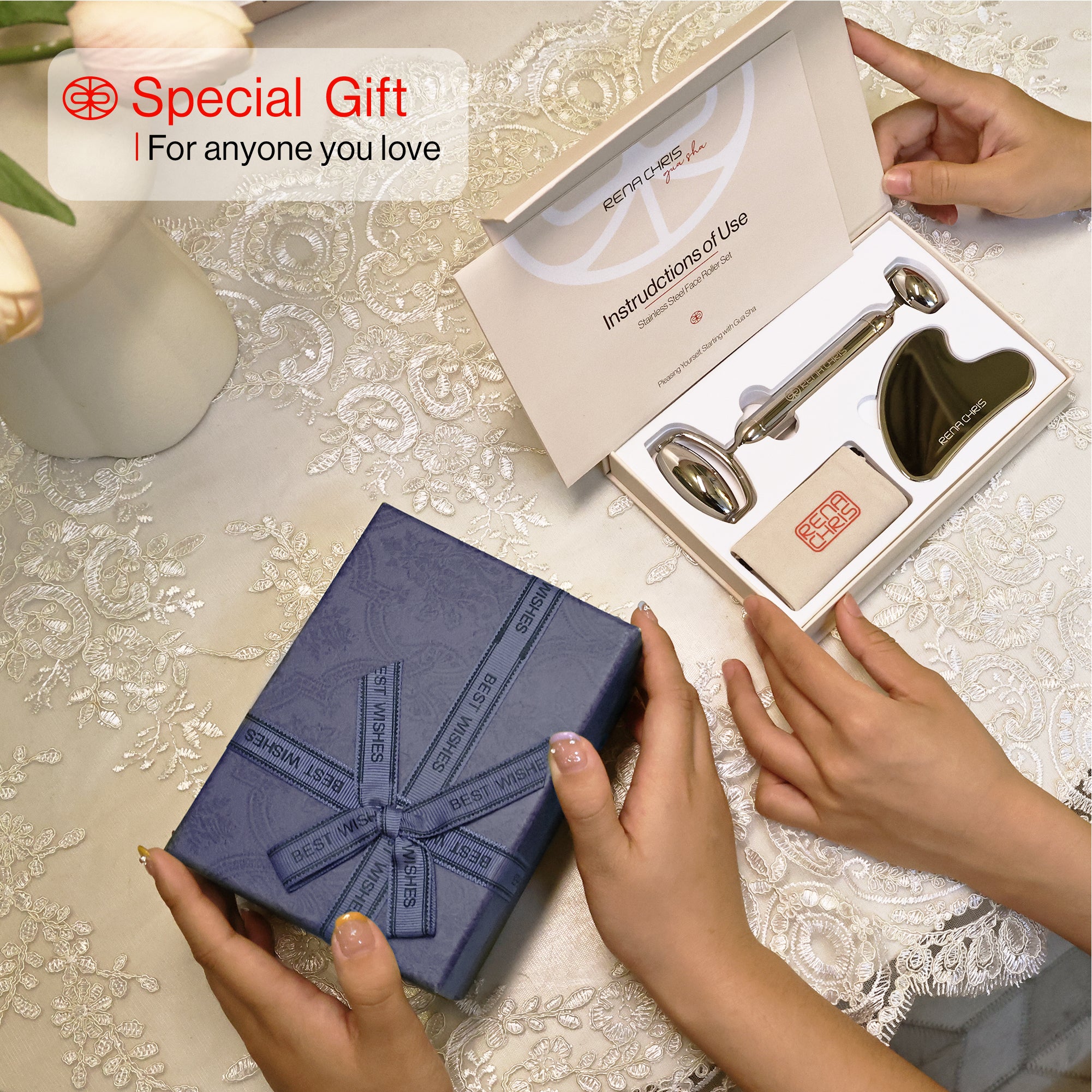 We are pleased to recommend this combo kit, Rena Chris Stainless Steel Facial Roller cools and relaxes the skin, reduces facial puffiness, minimizes pores, and promotes skin elasticity and vitality. And the Rena Chris Stainless Steel Gua Sha Tool is designed to improve your body's overall health, improve lymphatic drainage and blood circulation, and sculpt your face.