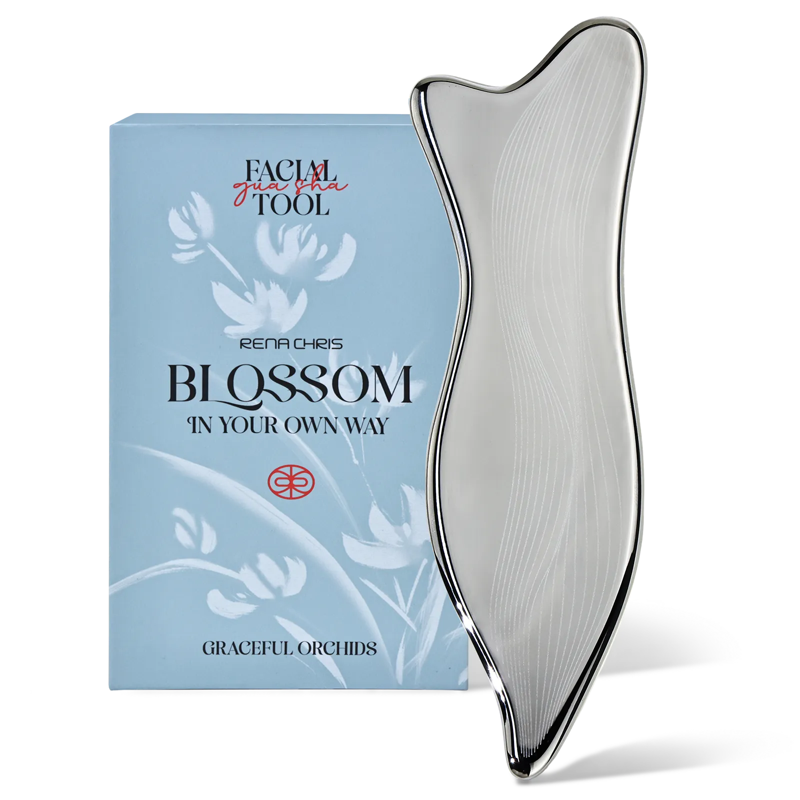 The Rena Chris Oriental Blossom Gua Sha Tool features a graceful silhouette and a thoughtfully curved design that glides along facial contours with ease, delivering a smoother, cooler, and more comfortable gua sha experience.
